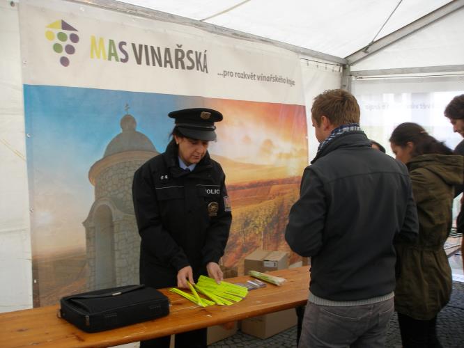 dárek v podobě reflexního proužku potěšil.jpg dopravní informace návštěvníci uvítali.jpg informace o odbourávání alkoholu.jpg návštěvníci měli o reflexní prvky zájem.jpg potřebné informace z dopravy.jpg reflexní prvky pro šťastný návrat.jpg vinařská akce v regionu.jpg